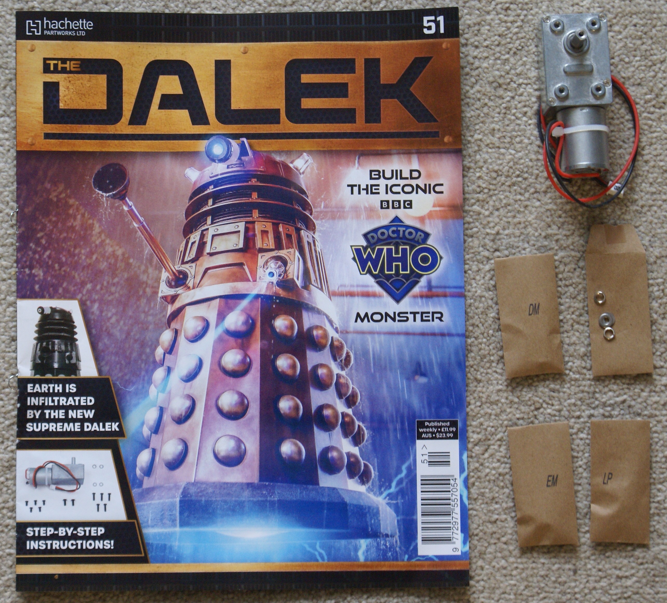 Well this adds the first motor to the last stretcher and has the first wheel mounted. The next set of parts will add another motor, followed by at least a third four weeks after that. There is a lot of waiting in this process. At least the second stretcher seems to have addressed the problem of it not screwing up tight enough as this one went together nicely. It takes longer to do this documentation that it does to assemble the parts supplied ...
