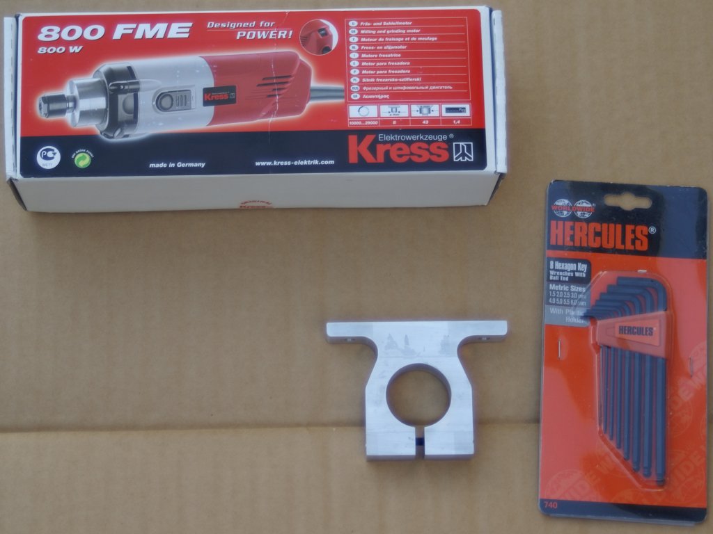 The Kress spindle comes with an 8mm collet, so additional collets will be required for the normal tooling, although a pair of 6mm and 3mm or 1/4" and 1/8" will probably cover most tooling requirements.